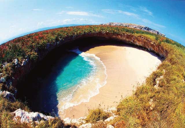 The Marieta Islands were used for bomb practice by the Mexican officials back in the early 1900s. After a civil uproar the government declared the island a natural park. After some years, tides brought sand and water in, and the result is in front of your eye.